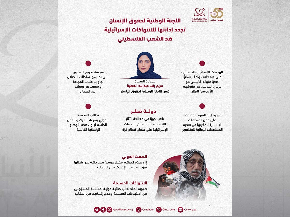 الدوحة في 03 أغسطس /قنا/ جددت اللجنة الوطنية لحقوق الإنسان إدانتها للانتهاكات الجسيمة التي يتعرض لها الشعب الفلسطيني الشقيق، جراء الهجمات الإسرائيلية المتكررة منذ السابع من أكتوبر 2023، في انتهاك صارخ لكافة قواعد القانون الدولي الإنساني والتزامات القانون الدولي لحقوق الإنسان، بما في ذلك الهجمات المتعمدة ضد السكان المدنيين والمنشآت المدنية.