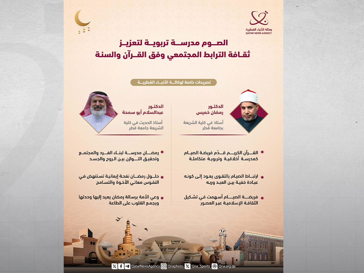 من جهته قال الدكتور عبدالسلام أبو سمحة أستاذ الحديث في كلية الشريعة بجامعة قطر، في تصريح مماثل لـ " قنا " إن شهر رمضان يمثل مدرسة متكاملة لبناء الفرد والمجتمع، ويجسد أسمى معاني التوازن بين الروح والجسد، وبين الفرد والجماعة.