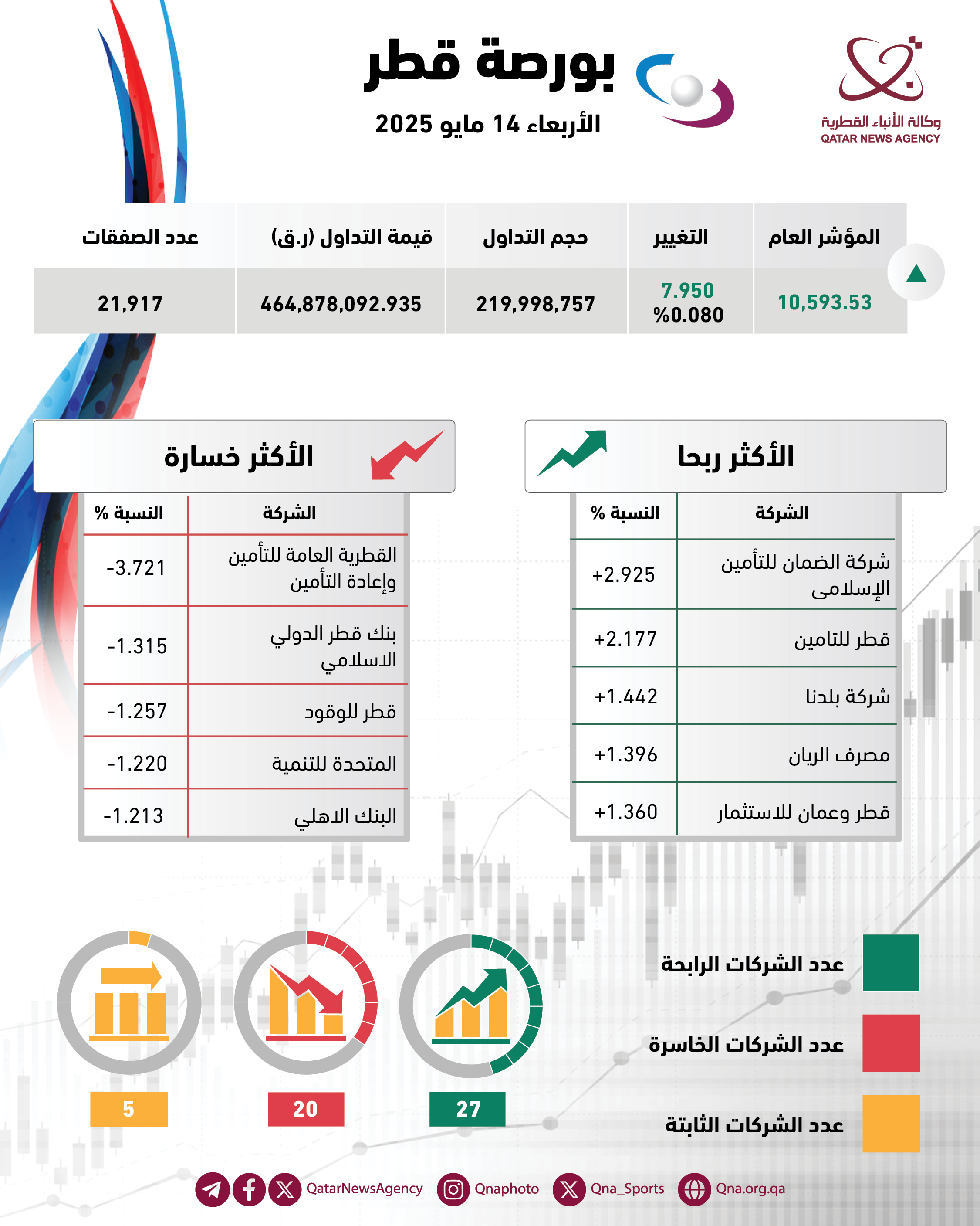 الدوحة في 14 مايو /قنا/ أغلق مؤشر بورصة قطر تداولاته، اليوم، مرتفعا بواقع 7.95 نقطة، أي بنسبة 0.08 بالمئة، ليصل إلى مستوى 10593.53 نقطة.