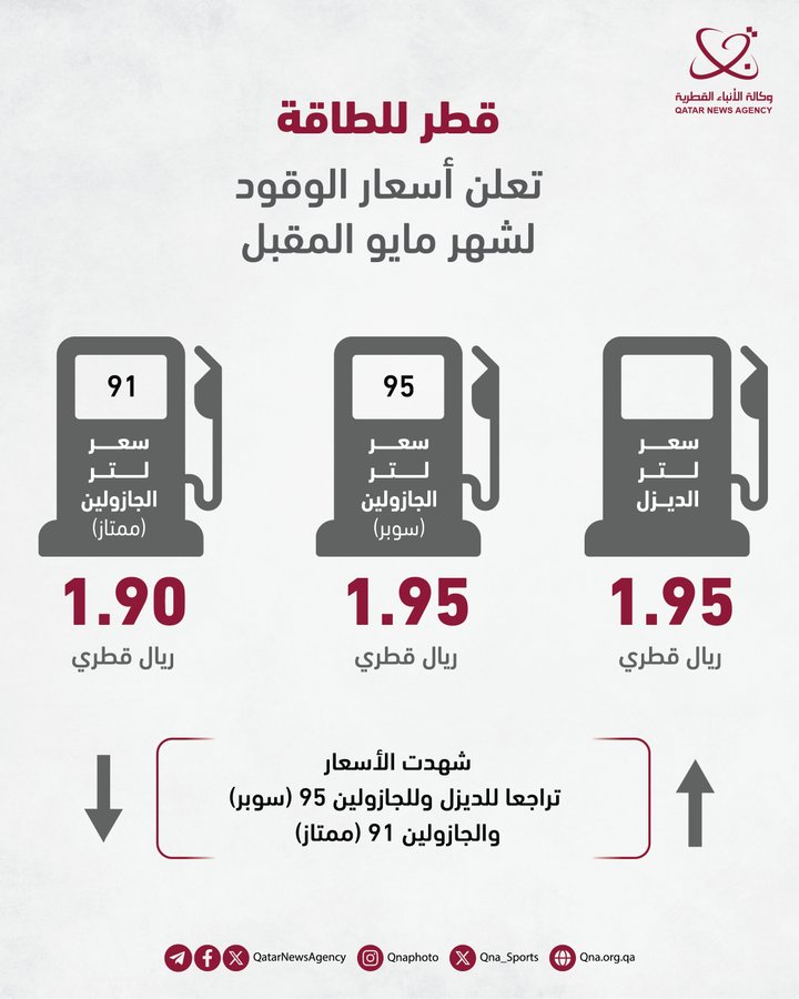وحددت قطر للطاقة سعر لتر الديزل بـ 1.95 ريال، وسعر الجازولين 95 (سوبر) بـ 1.95 ريال للتر الواحد، وسعر الجازولين 91 (ممتاز) بـ 1.90 ريال للتر الواحد.