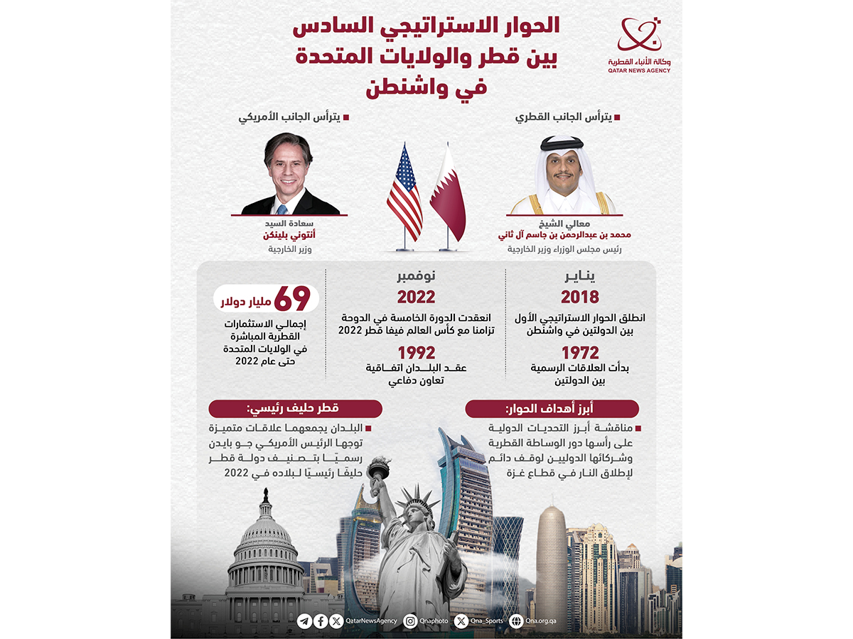 الدوحة في 05 مارس /قنا/ ينعقد الحوار الاستراتيجي السنوي بين دولة قطر والولايات المتحدة الأمريكية للمرة السادسة تواليا لمناقشة آفاق التعاون المشترك بين البلدين وتعزيز مضامينه.