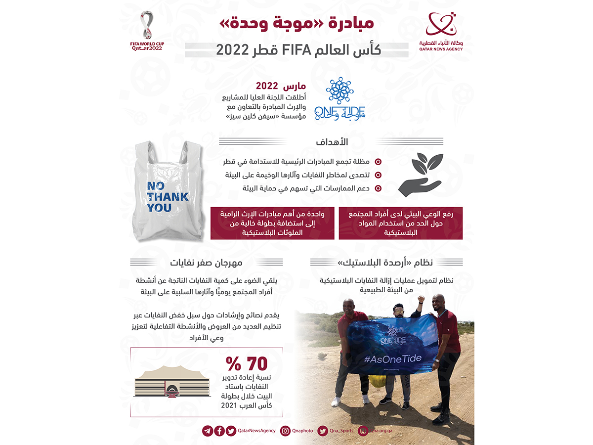 الدوحة في 17 نوفمبر /قنا/ بالتزامن مع انطلاق منافسات كأس العالم FIFA قطر 2022، تبدأ فعاليات مهرجان صفر نفايات، واستعداداً لهذا المهرجان أطلقت اللجنة العليا للمشاريع والإرث في مارس الماضي، مبادرة موجة وحدة .