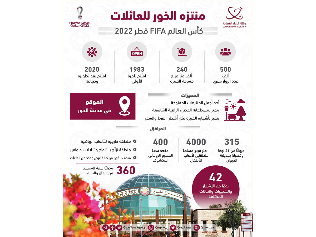 الدوحة في 16 نوفمبر /قنا/ يعد منتزه الخور من أبرز الوجهات الترفيهية للعائلات في دولة قطر، وقد افتتح عام 1983، ثم تم تطويره وصيانته وإعادة افتتاحه في 16 فبراير 2020 .