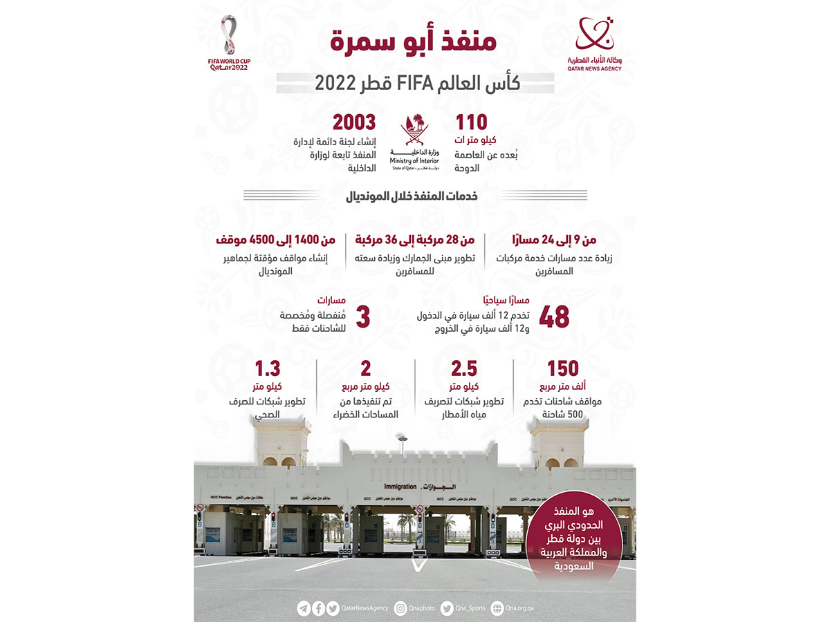 الدوحة في 14 نوفمبر /قنا/ يربط منفذ أبوسمرة البري، الذي يبعُد نحو 110 كيلومترات عن العاصمة الدوحة، بين دولة قطر والمملكة العربية السعودية، وسيكون بوابة جماهير كأس العالم FIFA قطر 2022 .