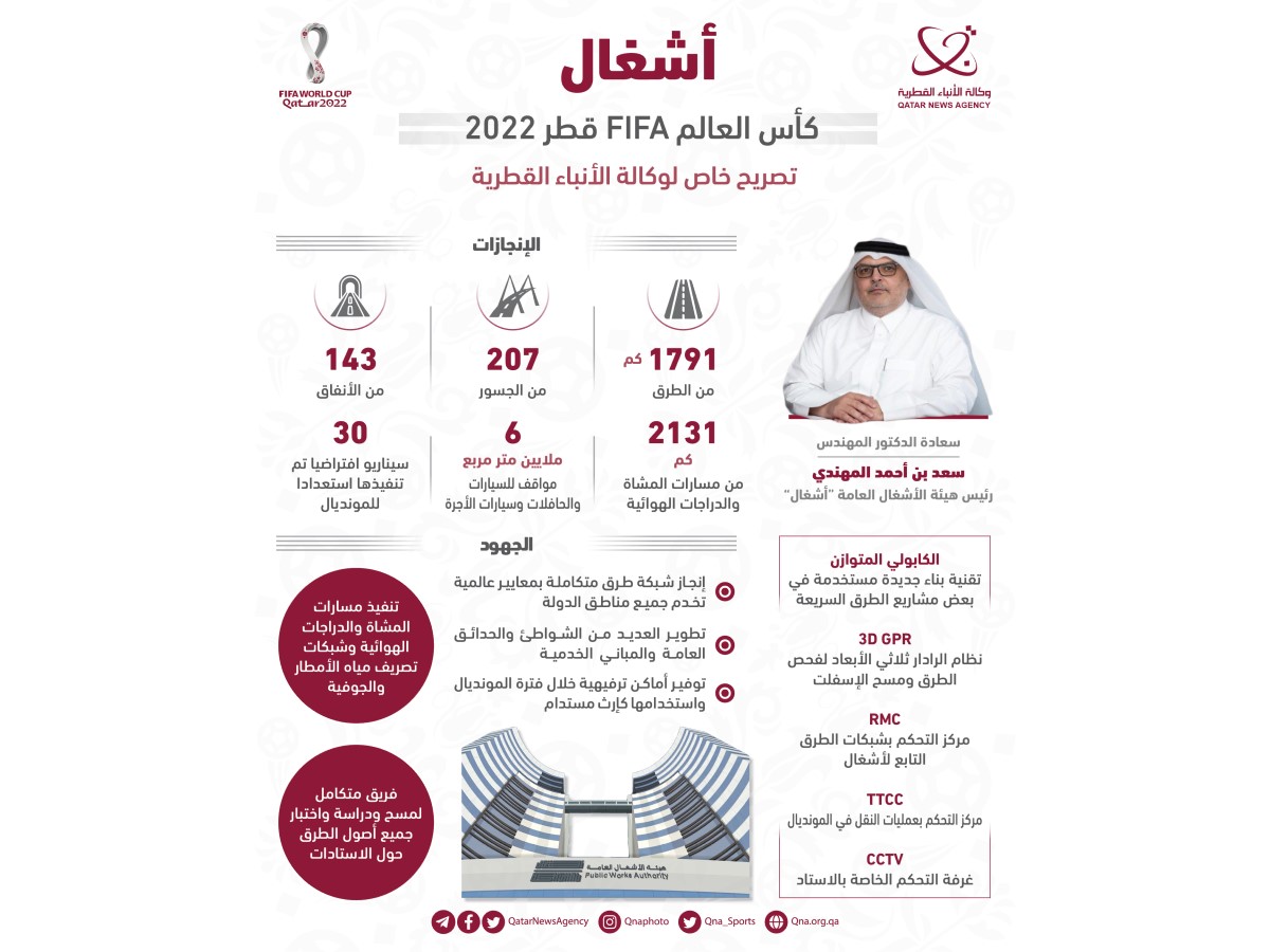 الدوحة في 12 نوفمبر /قنا/ لم تدخر هيئة الأشغال العامة "أشغال" والعاملون فيها أي جهد في تنفيذ المشروعات المتعلقة ببطولة كأس العالم FIFA قطر 2022 وفق أعلى المعايير العالمية.