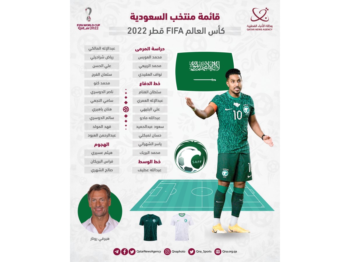 الرياض في 11 نوفمبر /قنا/ أعلن الاتحاد السعودي لكرة القدم، اليوم، القائمة النهائية للاعبي المنتخب التي ستخوض نهائيات كأس العالم FIFA قطر 2022.