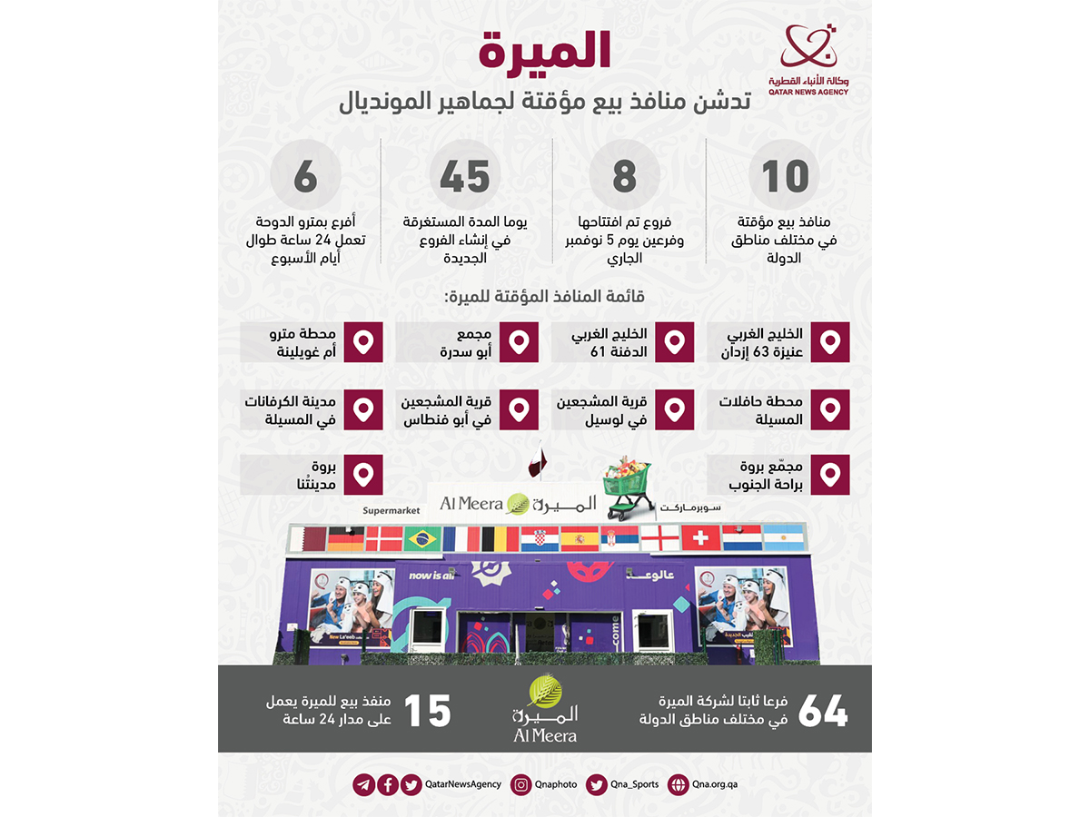 الدوحة في 02 نوفمبر /قنا/ أعلنت وزارة التجارة والصناعة، بالتعاون مع وزارة البلدية واللجنة العليا للمشاريع والإرث وشركة الميرة للمواد الاستهلاكية، عن افتتاح منافذ بيع مؤقتة وقريبة من أماكن تواجد جماهير بطولة كأس العالم FIFA قطر 2022.