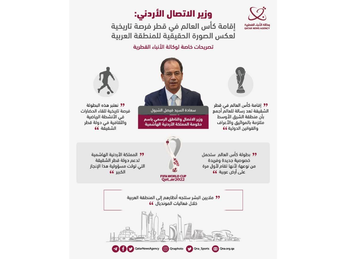 الدوحة في 01 نوفمبر /قنا/ أكد سعادة السيد فيصل الشبول، وزير الاتصال والناطق الرسمي باسم الحكومة الأردنية، أن إقامة بطولة كأس العالم في دولة قطر.