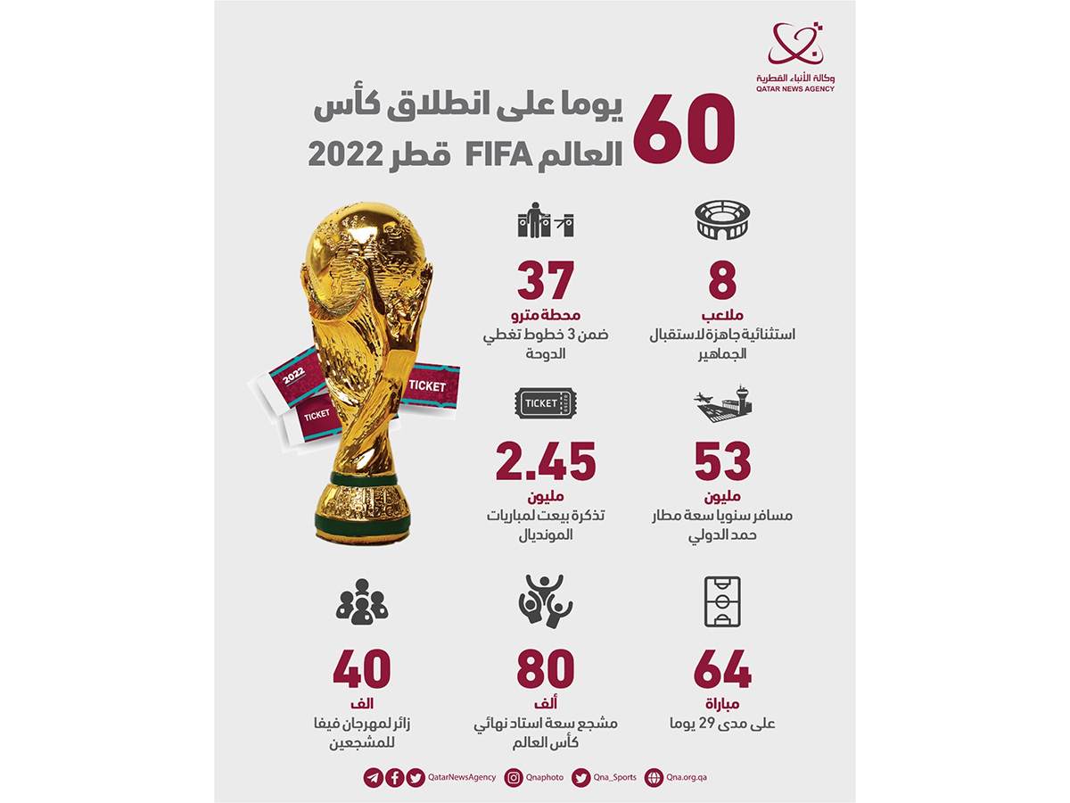 الدوحة في 20 سبتمبر /قنا/ تضاعفت وتيرة الاستعدادات في دولة قطر مع تبقي 60 يوماً على انطلاق نهائيات كأس العالم FIFA قطر 2022.