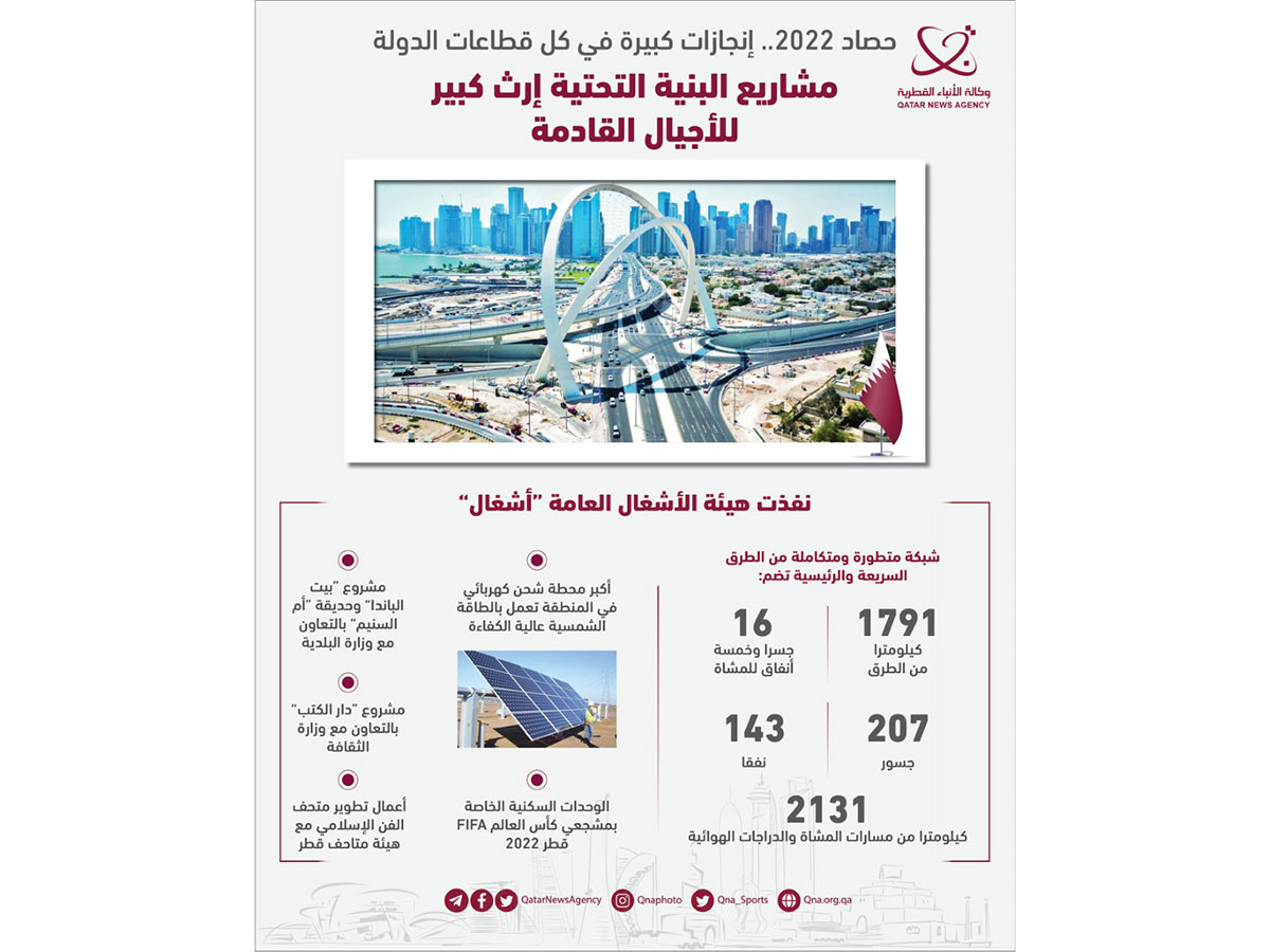 الدوحة في 31 ديسمبر /قنا/ شهد عام 2022 إنجازات قطرية على كافة الصعد والمستويات، جعلت منه عاما استثنائيا يضاف إلى رصيد قطر من النجاحات، تحت قيادة حضرة صاحب السمو الشيخ تميم بن حمد آل ثاني أمير البلاد المفدى "حفظه الله".