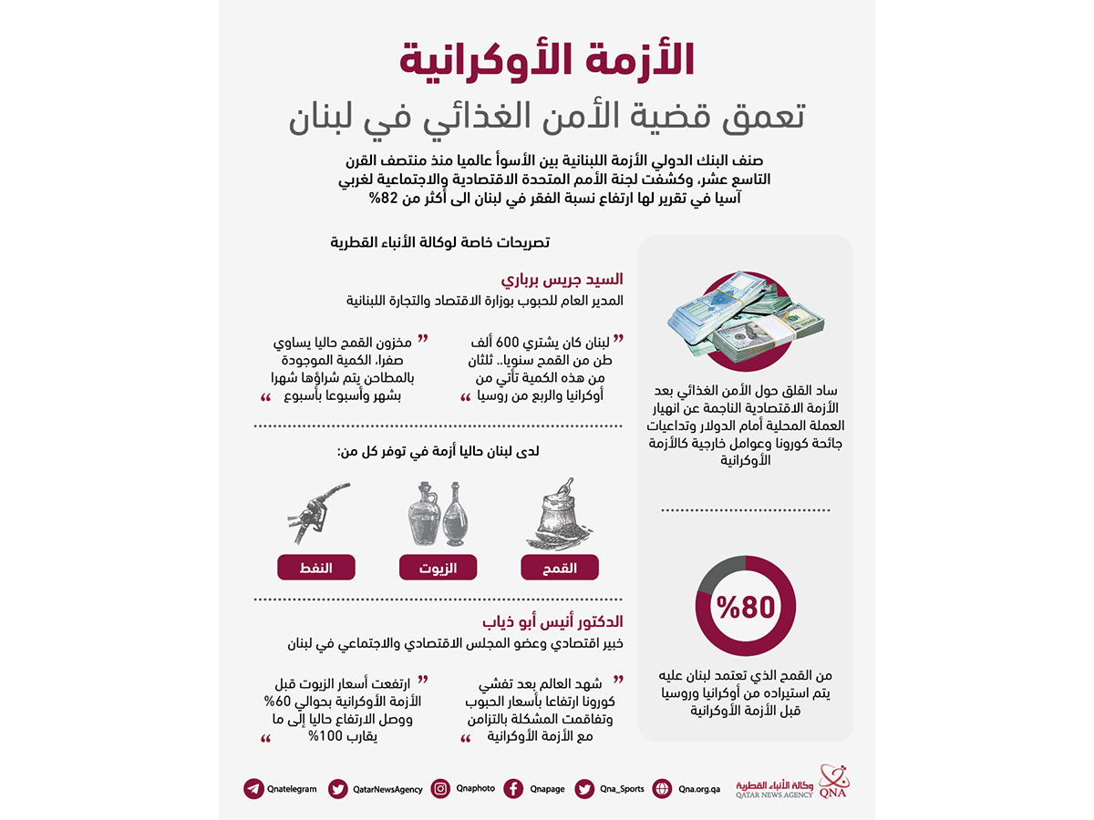 بيروت في 22 مارس /قنا/ في الوقت الذي يرزح فيه أكثر من 80 % من الشعب اللبناني تحت وطأة الفقر أصبح الأمن الغذائي مصدر قلق بالغ للكثيرين خاصة بعد الأزمة الأوكرانية.