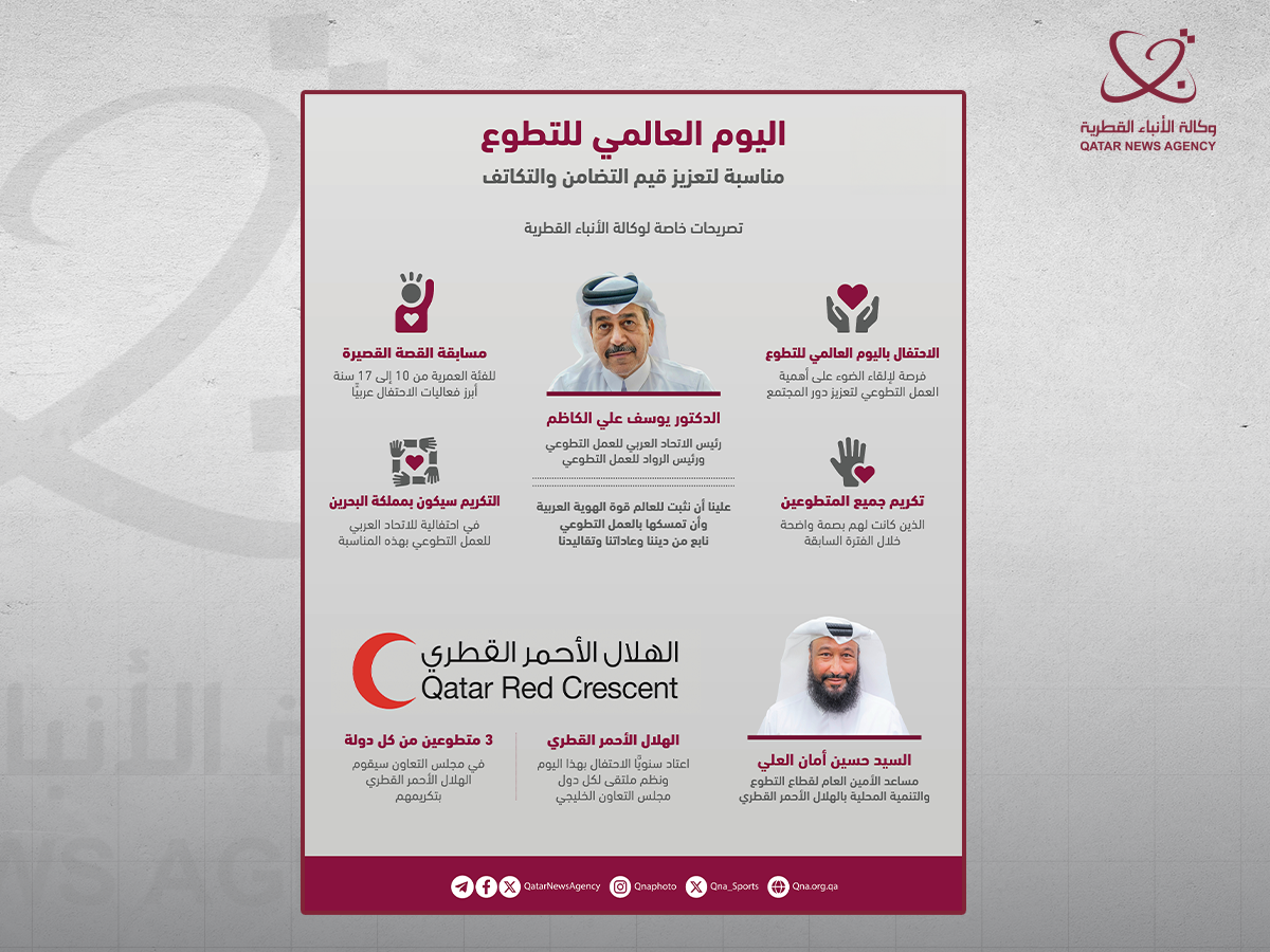 الدوحة في 04 ديسمبر /قنا/ تحتفي الأسرة الدولية في الخامس من ديسمبر من كل عام، باليوم العالمي للتطوع؛ للاحتفاء بجميع المتداخلين والعاملين في العمل الإنساني التطوعي في جميع أنحاء العالم، لما يخصصونه من وقت وجهود ثمينة لخدمة الآخرين، ولخدمة البشرية.