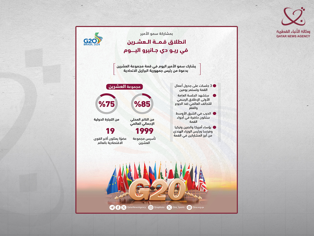 الدوحة في 18 نوفمبر /قنا/ يشارك حضرة صاحب السمو الشيخ تميم بن حمد آل ثاني أمير البلاد المفدى، اليوم في قمة مجموعة العشرين، وذلك بدعوة من فخامة الرئيس لويس إيناسيو لولا دا سيلفا رئيس جمهورية البرازيل الاتحادية الصديقة.