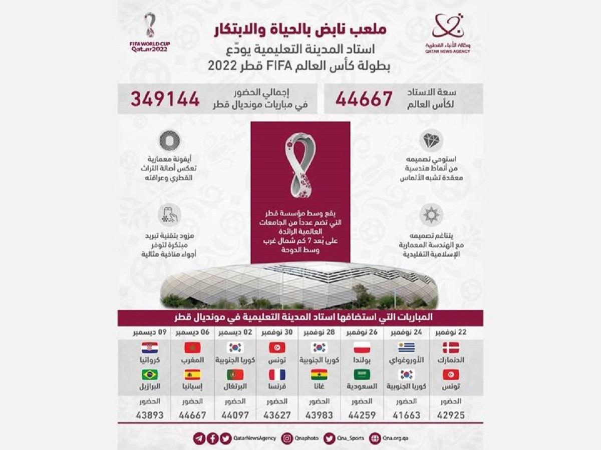 Doha, December 10 (QNA) - Qatar Foundation's (QF) Education City Stadium hosted Friday the last of the eight matches on its pitch, with Brazil playing against Croatia. In all, the stadium saw a cumulative attendance of around 350,000 people.