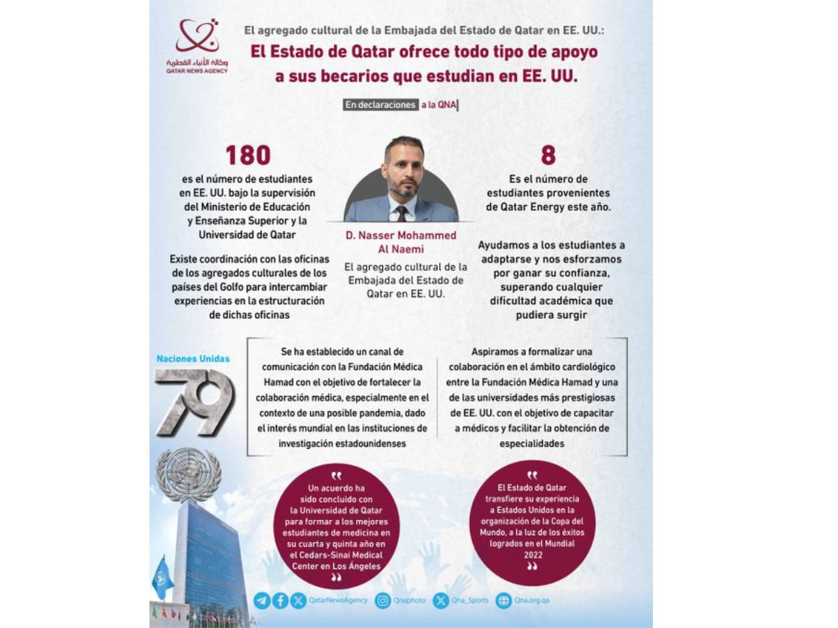 Washington, el 21 de septiembre (QNA) — El D. Nasser Mohammed Al Nuaimi, agregado cultural en la Embajada del Estado de Qatar en los Estados Unidos de América, destacó que el Estado de Qatar ofrece diversas formas de apoyo a sus estudiantes enviados a estudiar en el país. Señaló que la Oficina Cultural se ocupa de los asuntos académicos y de investigación entre ambas naciones, así como del desarrollo académico de los trabajadores y estudiantes, y de cómo prepararlos profesionalmente.