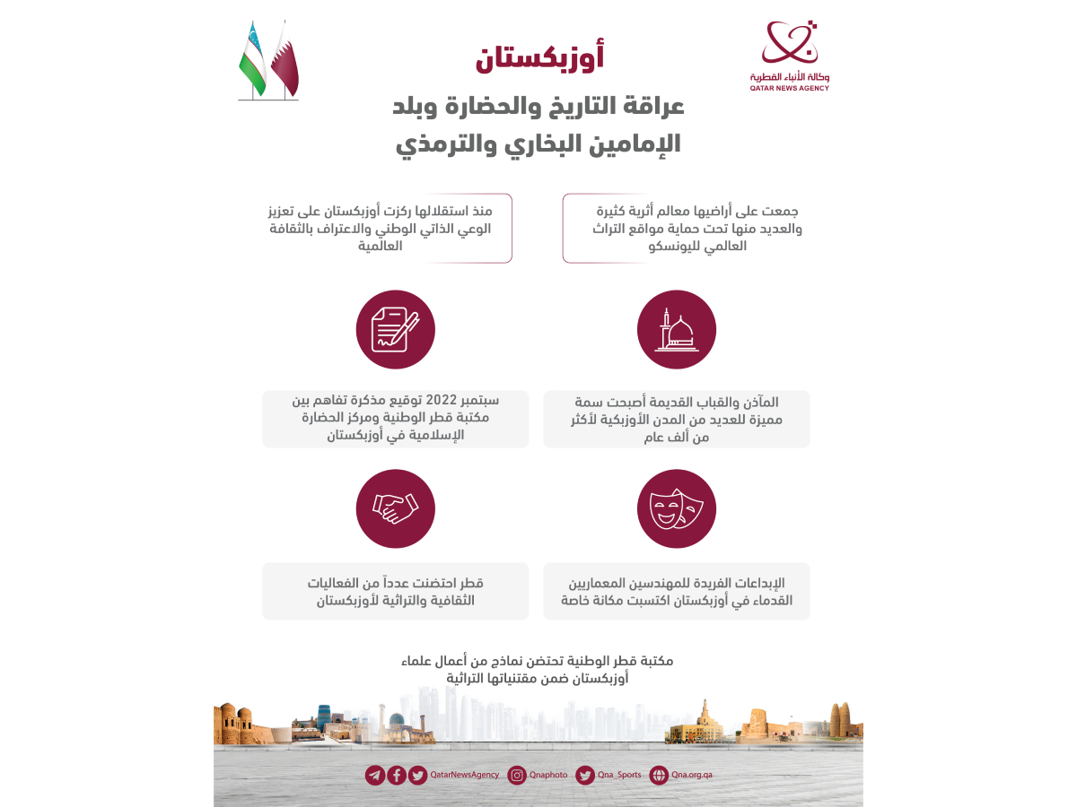 الدوحة في 06 يونيو /قنا/ تفخر جمهورية أوزبكستان بثراء ثقافتها وتقاليدها التي نسجت على مر قرون عديدة، ما جعلها متفردة في تاريخها وحضارتها الضاربتين عبر الأزمان.