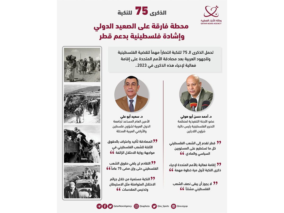 الدوحة في 15 مايو /قنا/ تحمل الذكرى الـ 75 للنكبة انتصاراً مهماً للقضية الفلسطينية، وكذلك للجهود العربية لدعمها لدى المجتمع الدولي، لا سيما بعد مصادقة الجمعية العامة للأمم المتحدة.
