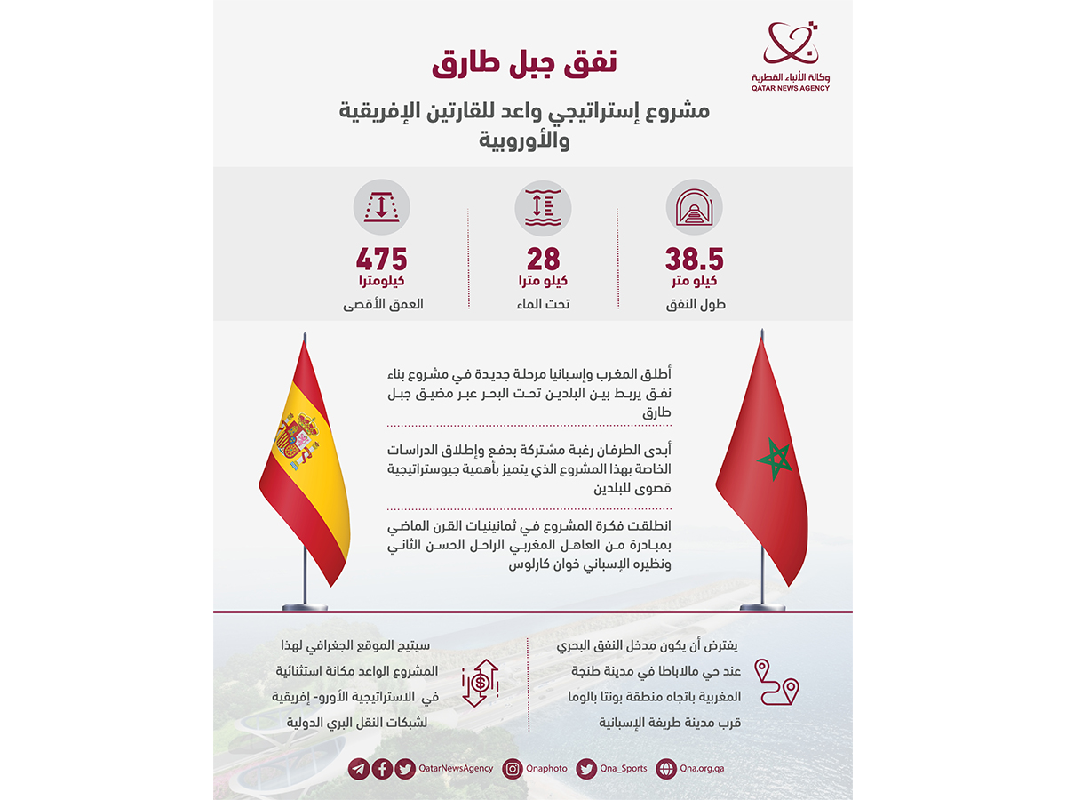 الدوحة في 18 أبريل /قنا/ أطلق المغرب وإسبانيا مرحلة جديدة في مشروع بناء نفق يربط بين البلدين تحت البحر عبر مضيق جبل طارق.