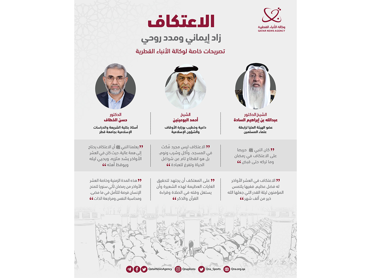 الدوحة في 14 أبريل /قنا/ يعد الاعتكاف أحد الشعائر الإيمانية والتعبدية التي تميز شهر رمضان تحديدا، ويحرص بعض المسلمين على إحيائها تأسيا بالنبي صلى الله عليه وسلم الذي داوم عليها وخاصة في العشر الأواخر من الشهر الفضيل كما تؤكد ذلك الأحاديث النبوية الشريفة.