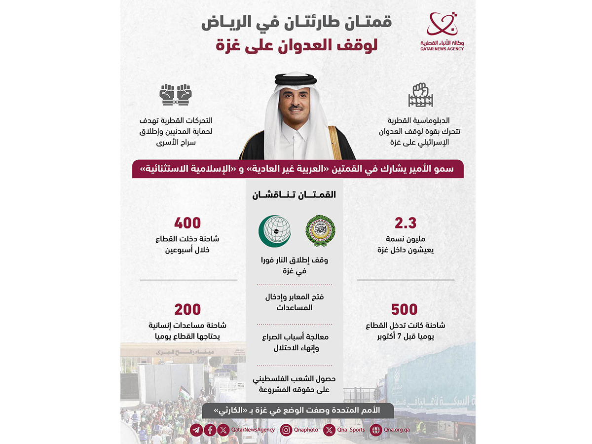 الدوحة في 10 نوفمبر /قنا/ انطلاقا من حرص دولة قطر الثابت والراسخ على دعم القضية الفلسطينية ونصرة شعبها في كل المحافل لنيل حقوقه المشروعة، يشارك حضرة صاحب السمو الشيخ تميم بن حمد آل ثاني أمير البلاد المفدى، في أعمال القمة غير العادية لمجلس جامعة الدول العربية والقمة الإسلامية الاستثنائية الثامنة