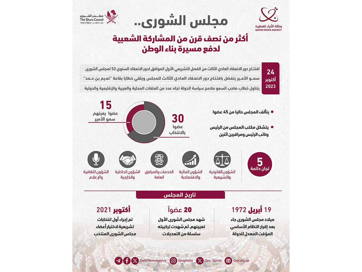 الدوحة في 23 أكتوبر /قنا/ تدشن دولة قطر غدا الثلاثاء مرحلة جديدة من مسيرتها المباركة عبر خيار الشورى الذي ارتضته القيادة الرشيدة والشعب القطري الوفي.