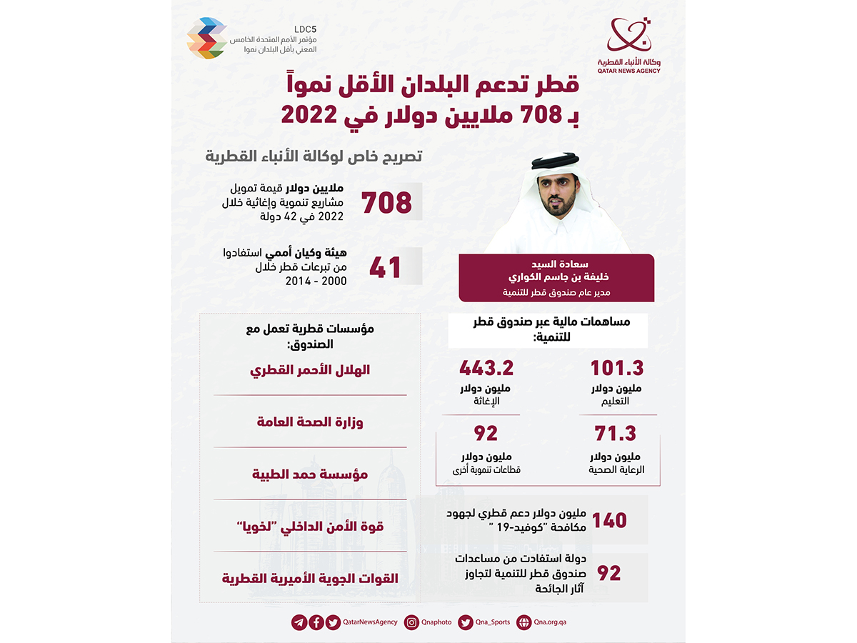 الدوحة في 01 مارس /قنا/ أيام قليلة تفصلنا عن بدء مؤتمر الأمم المتحدة لدعم البلدان الأقل نموا، الذي تنطلق أعماله في الدوحة من 5 إلى 9 مارس، وتعتبر دولة قطر من أكبر الدول المانحة والداعمة لهذه البلدان وتولي اهتماما خاصا بها .