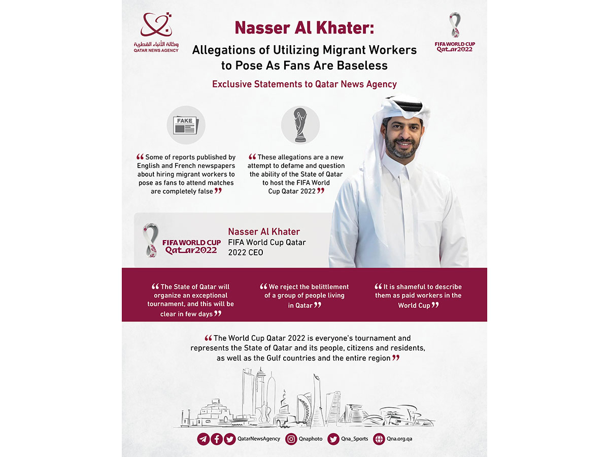 Doha, November 16 (QNA) - FIFA World Cup Qatar 2022 CEO Nasser Al Khater denounced allegations by Western media about tournament organizers using expatriate fans to attend matches in exchange for money.
