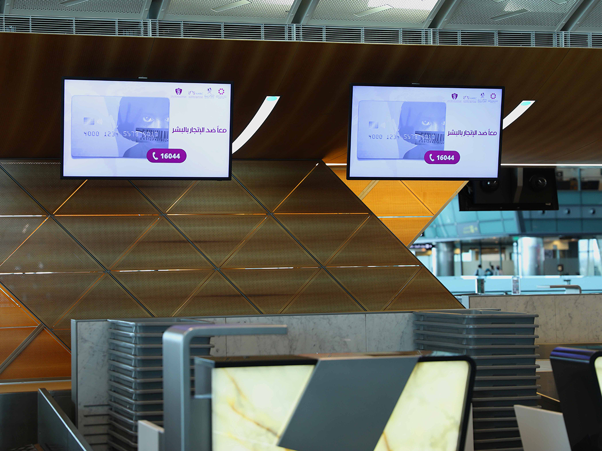 Doha, October 12 (QNA) - The Ministry of Labor, represented by the National Committee to Combat Human Trafficking, in cooperation with Hamad International Airport (HIA) and the National Human Rights Committee (NHRC), launched a campaign inside the airport building to raise awareness of human trafficking issues and announced the hotline dedicated to reporting abuses and violations regarding these issues.